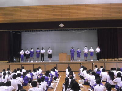 7月3日(月)全校朝会の中で県総体・コンクール壮行会が行われました。各部の代表が壇上に上がり、卓球部と女子バレーボール部のキャプテンが決意表明を行いました。生徒会長から激励の言葉があり、全校生徒から応援の気持ちのこもった拍手が送られました。その後、相原先生から大会が目前にせまったこの時期の心構えやコンディションニングについてのお話がありました。