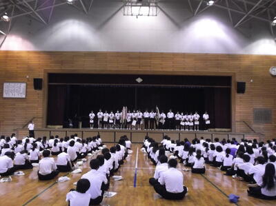 夏休み中の各種大会での活躍を全校で称賛する表彰状授与があり、多くの生徒が舞台上に上がりました。部活動等での努力の積み重ねを財産に、今後の学校生活でも目標をもってさまざまな活動に取り組んでいってくれることを願います。