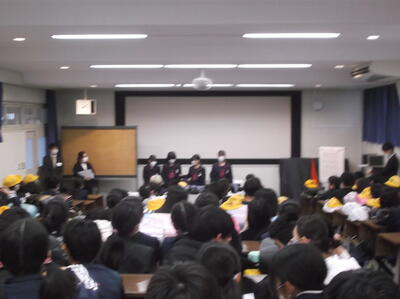 2月13日(月)、小学生の中学校体験を実施しました。川西・三宅両小学校の児童約110名が本校を訪ねてきてくれました。メインは、中学校の授業体験で、社会、英語、体育の中から希望する教科を選んで体験をしました。教員と双方向のコミュニケーションをとりながら授業体験に参加している様子が好印象でした。授業体験後、本校生徒会役員4名から学校の様子について説明があり、両校代表児童のしっかりとした挨拶を受け、無事終了することができました。卒業までの日々をがんばりぬいて、入学式を心身ともによい状態で迎えてくれることを願っています。