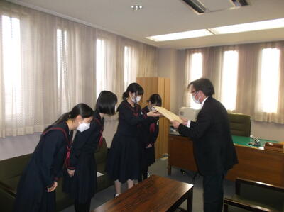 2月20日、生徒会活動の一環として行った、制服規定の改定を目指して行った署名活動について、式下中学校組合敎育委員会事務局の方にお伝えするために訪問しました。生徒会役員の話に耳を傾けてくださり、趣旨の確認や激励のお言葉をいただけて有意義な場となりました。生徒会活動は、「バトンをつなぐのと同じだ。」というお話が印象的でした。今後どういうふうに進んでいくかは全くの未知数ですが、次代のことを考えての生徒たちの声をどのように取り上げていけるのかを検討していきたいと思います。