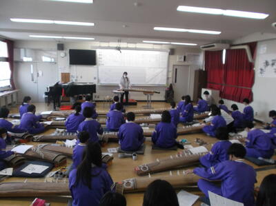 3月7日、8日の2日間、2年生が邦楽体験(箏の演奏)を行うことができました。竹村雅萌様にご指導をおただき、各学級2時間ずつ箏演奏の基礎を教わりました。1曲仕上げるところまでご指導いただき光栄でした。生徒たちも意欲的にお稽古する姿が見られ、和楽器にふれる貴重な時間となりました。連日4人の方にお越しいただき、手ほどきを受けることができました。有難うございました。